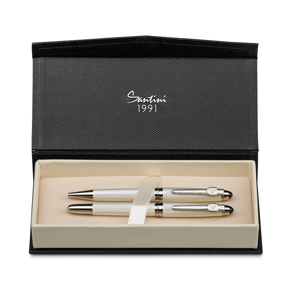 Ballpoint and roller ball pen set. Printed on cardboard and placed next to the box. Supplied in a padded gift box