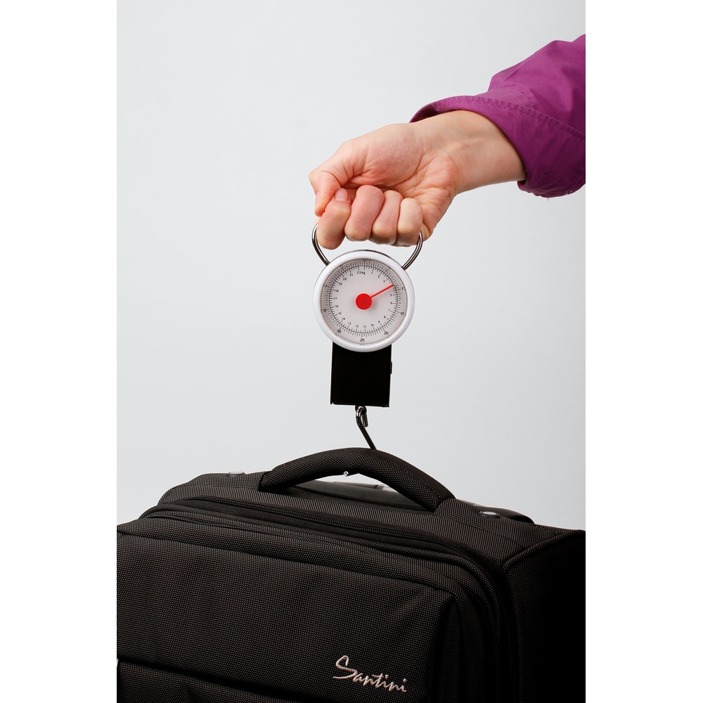 Plastic scale with metal handle and hook. Ideal for weighing your suitcases before you leave home. Capacity up to a maximum of 22 KG