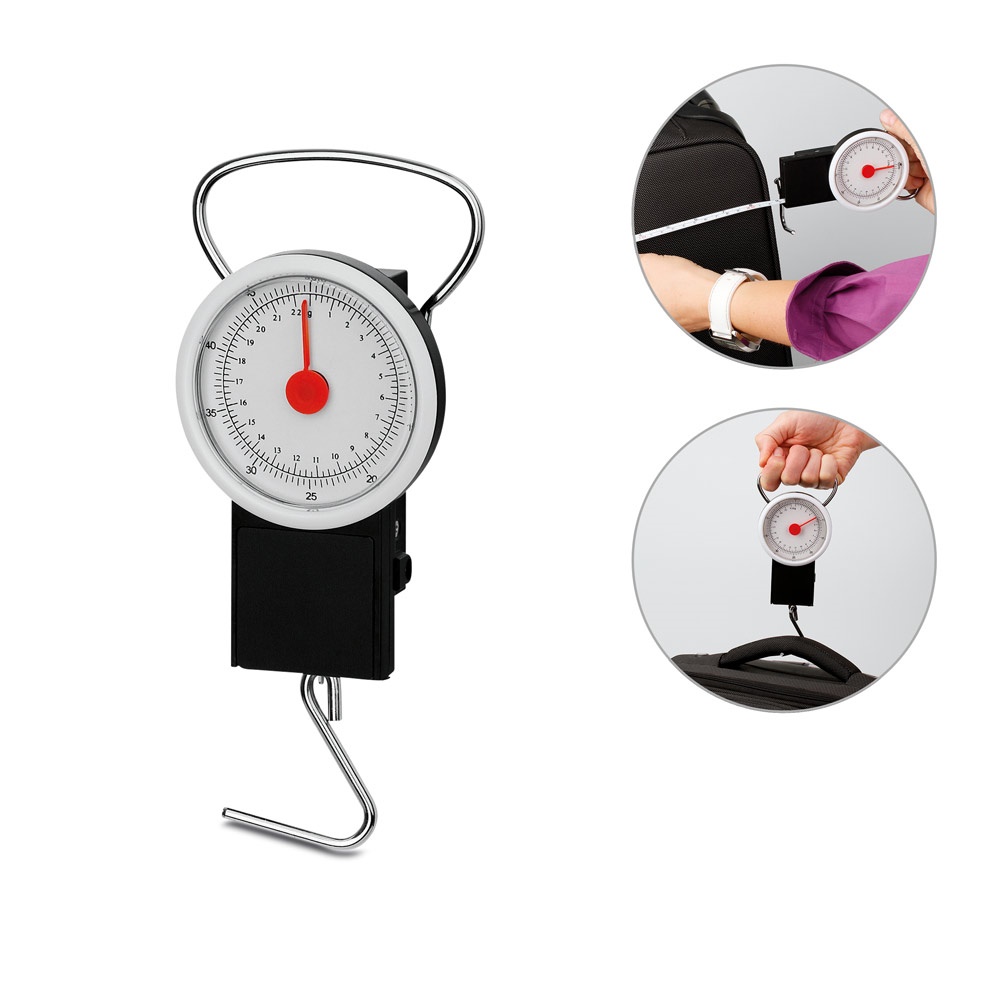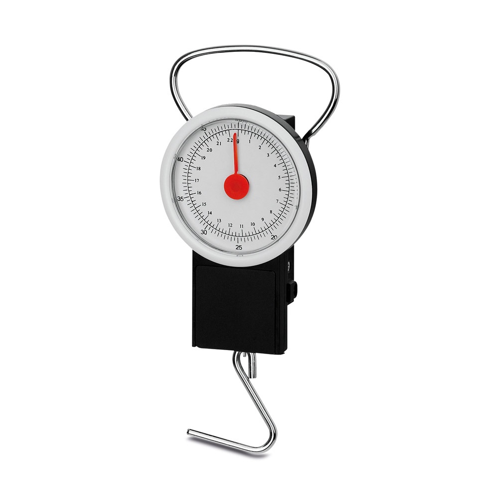 Plastic scale with metal handle and hook. Ideal for weighing your suitcases before you leave home. Capacity up to a maximum of 22 KG. 80 x 115 x 34 mm